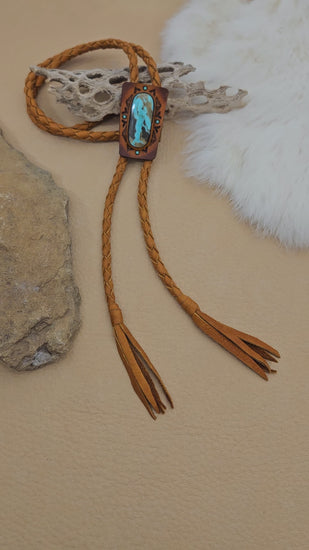 This beautiful bolo features genuine Kingman turquoise set in hand-painted, tooled leather. A supple deerskin braided cord with tassel tips completes the look.