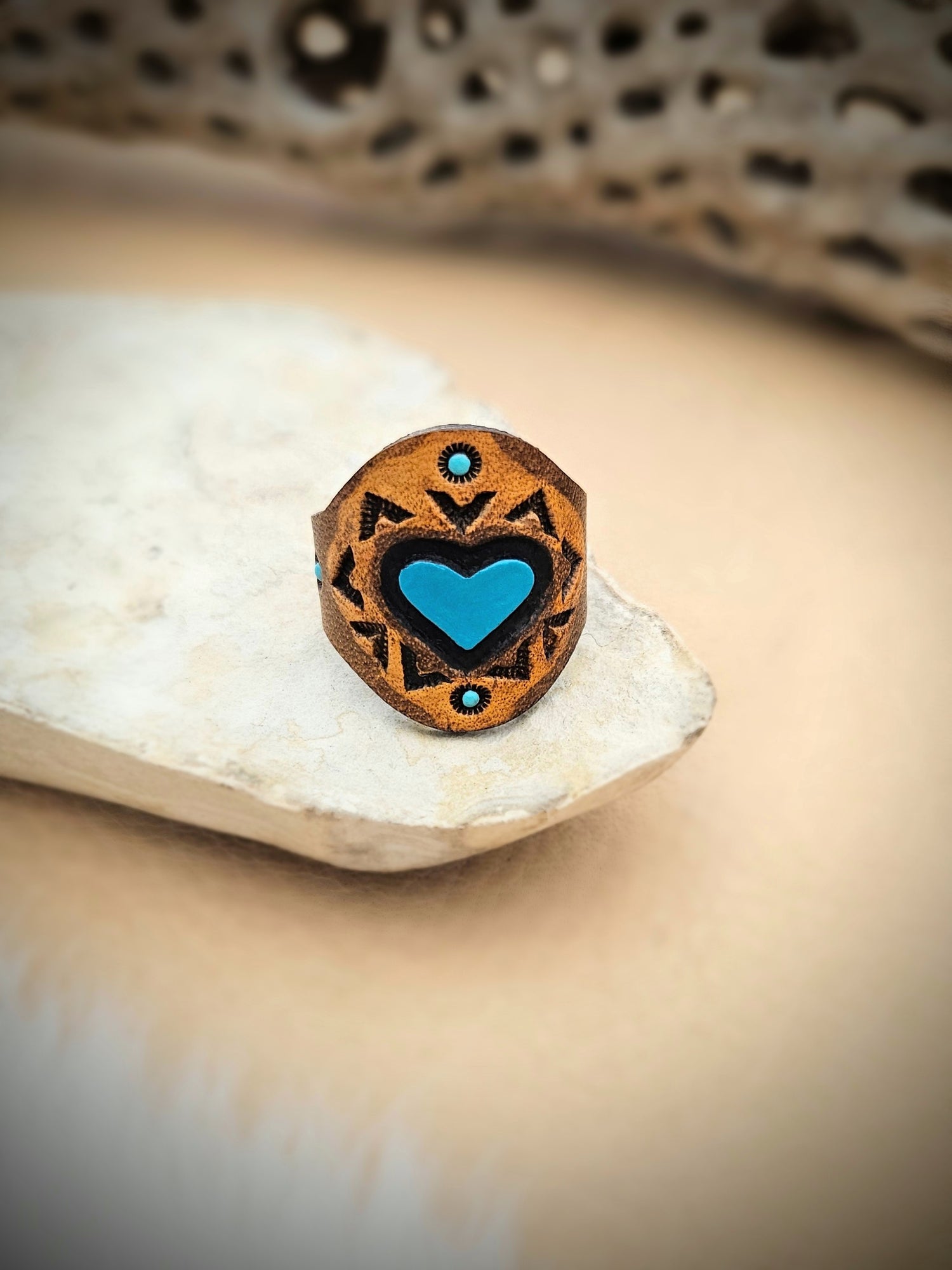 These beautiful heart rings are hand tooled, dyed and painted using vegetable tanned leather.