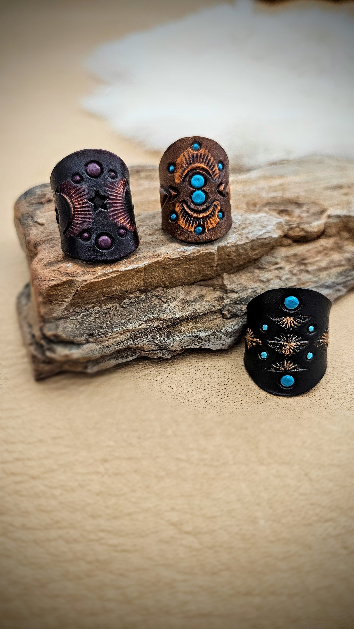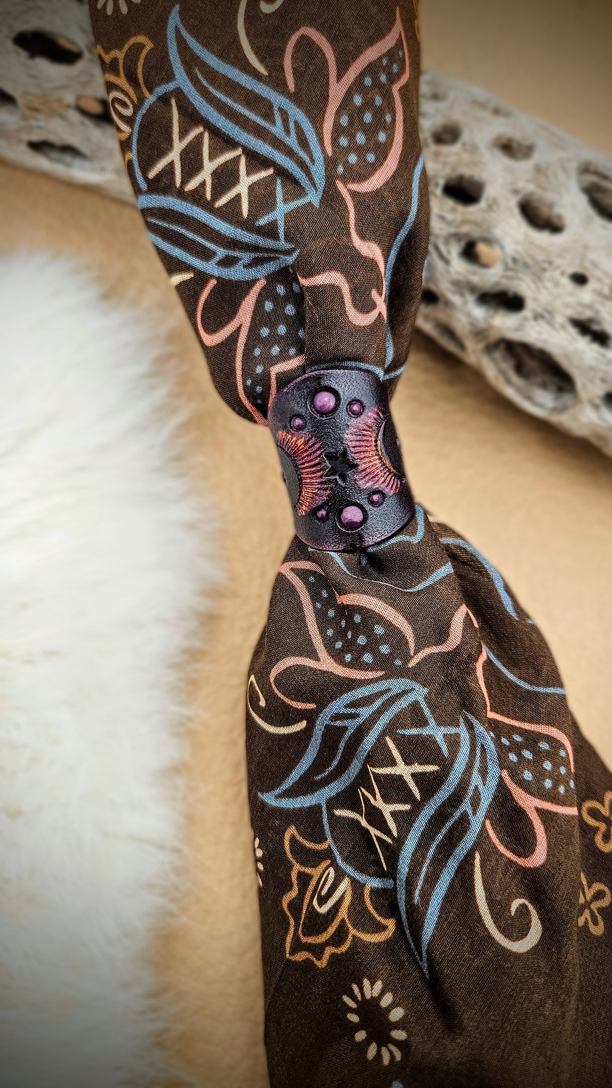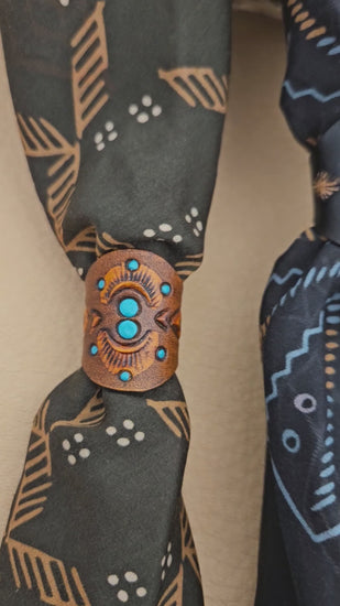 The leather scarf slides are hand tooled, dyed and painted using vegetable tanned leather. Available in antique brown, black or mahogany. Measures 1" in length.