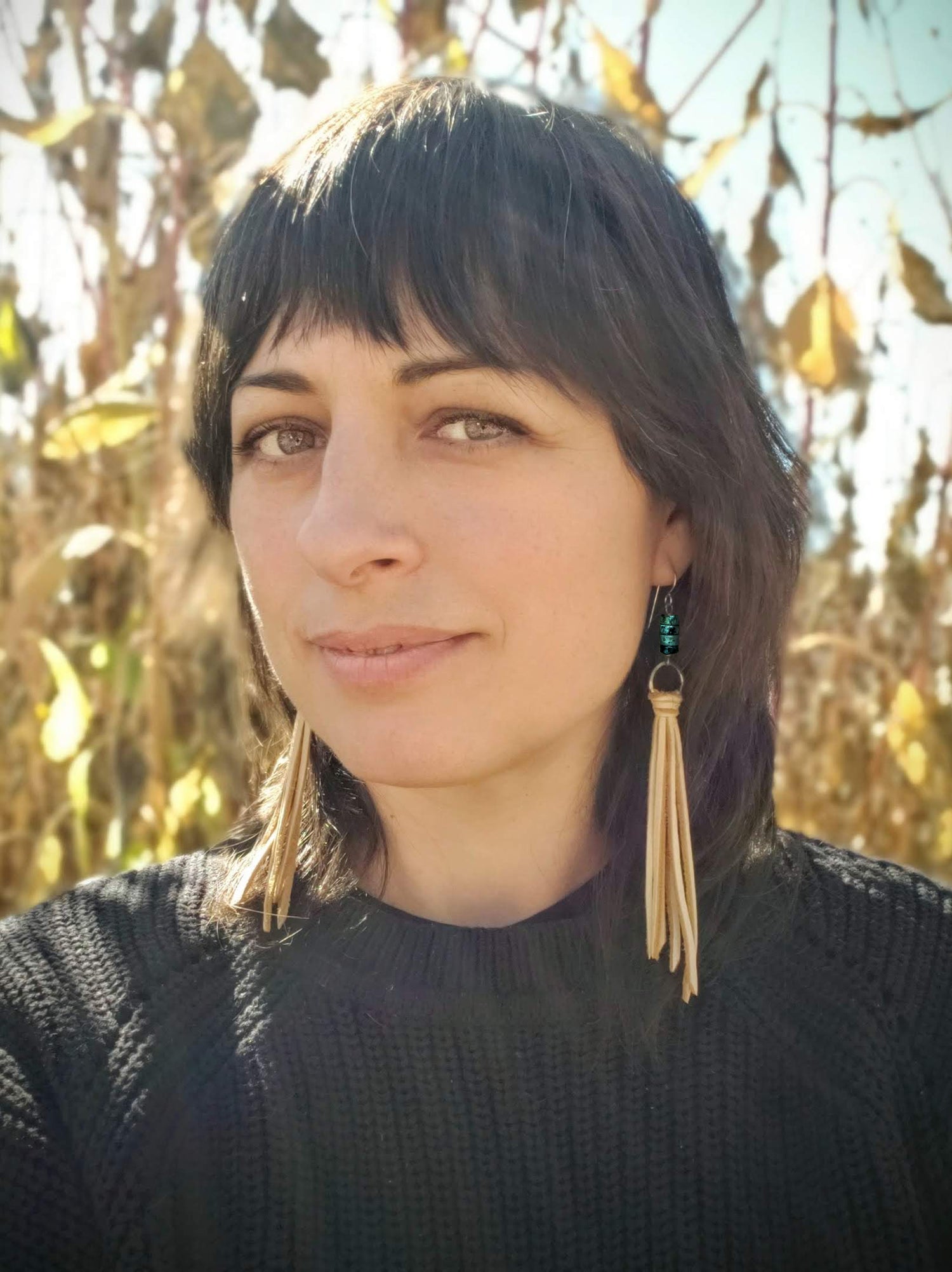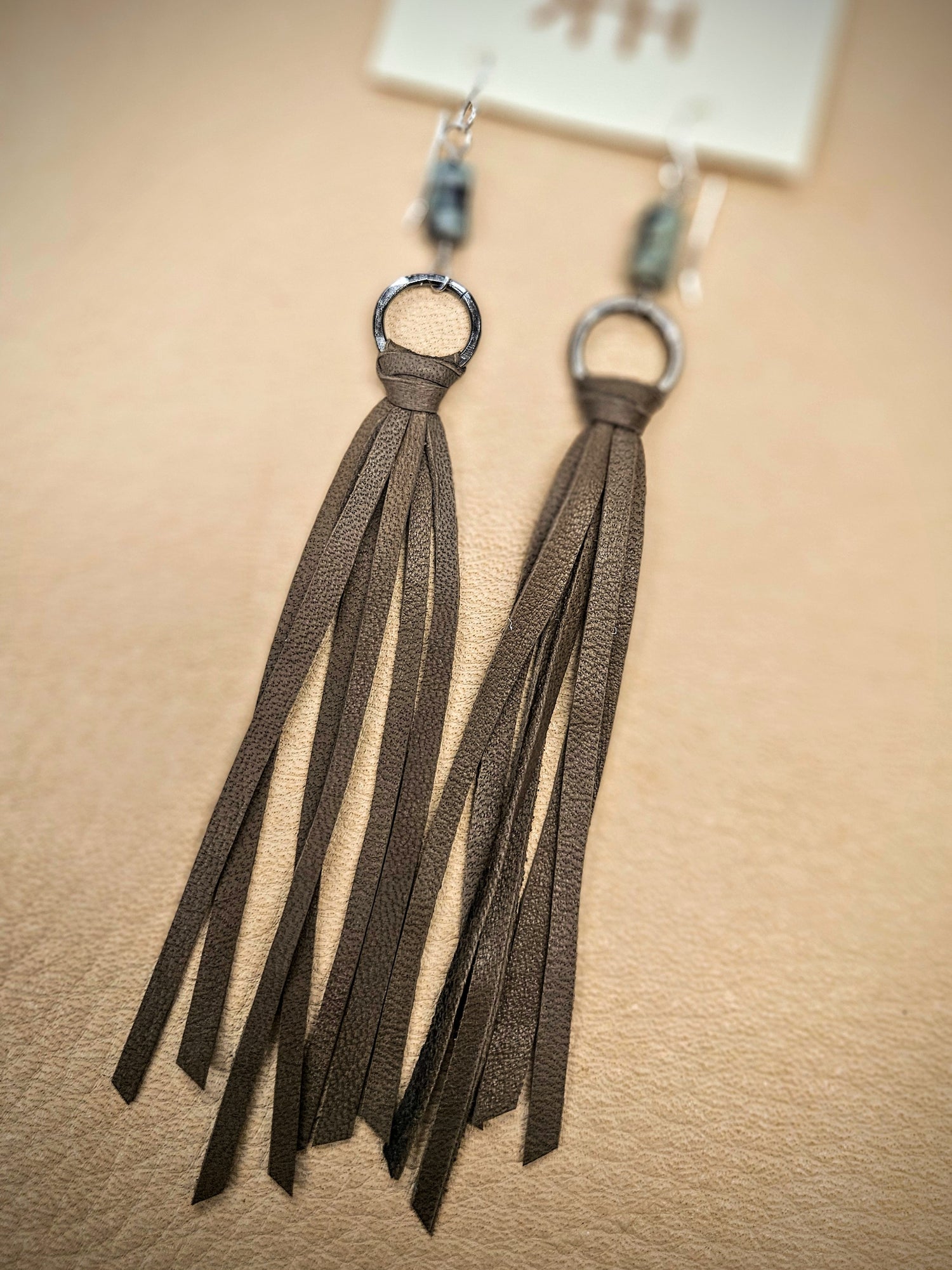 These long fringe duster earrings feature African turquoise beads, hand-hammered metal hoops, and repurposed leather. Ear hooks are made from sterling silver or 14k gold fill, depending on the color.